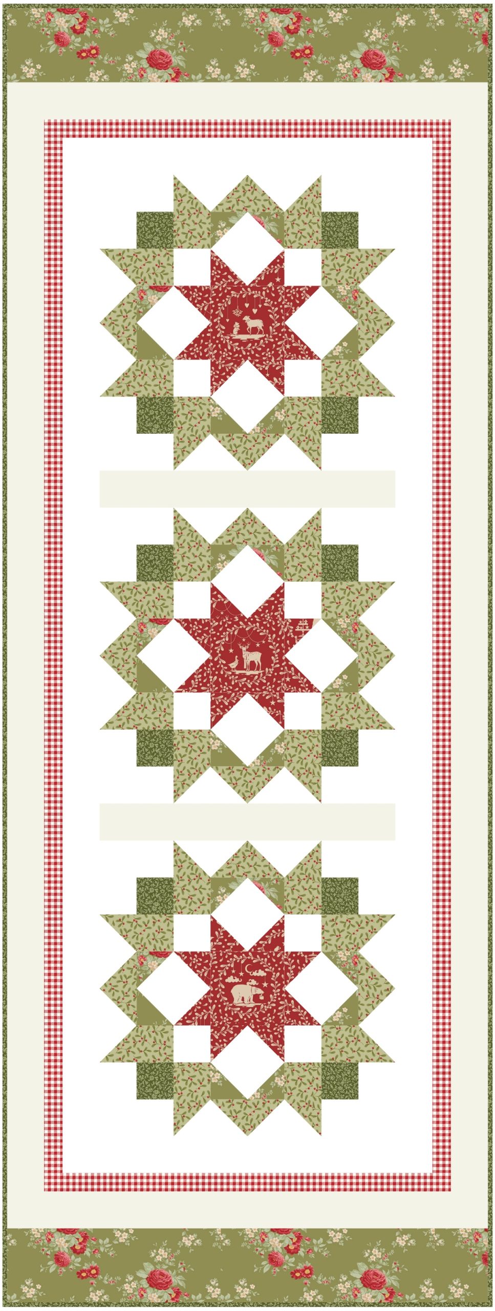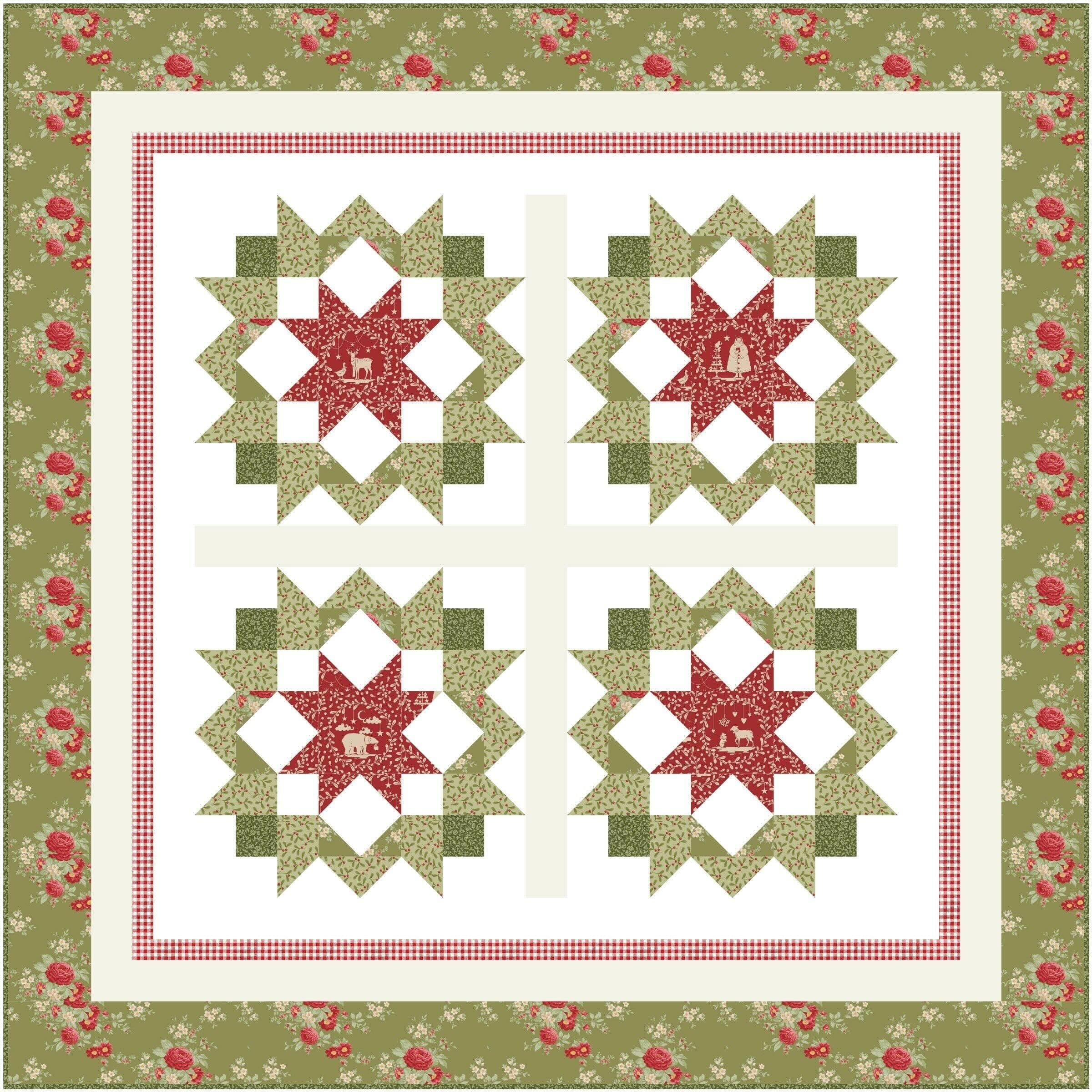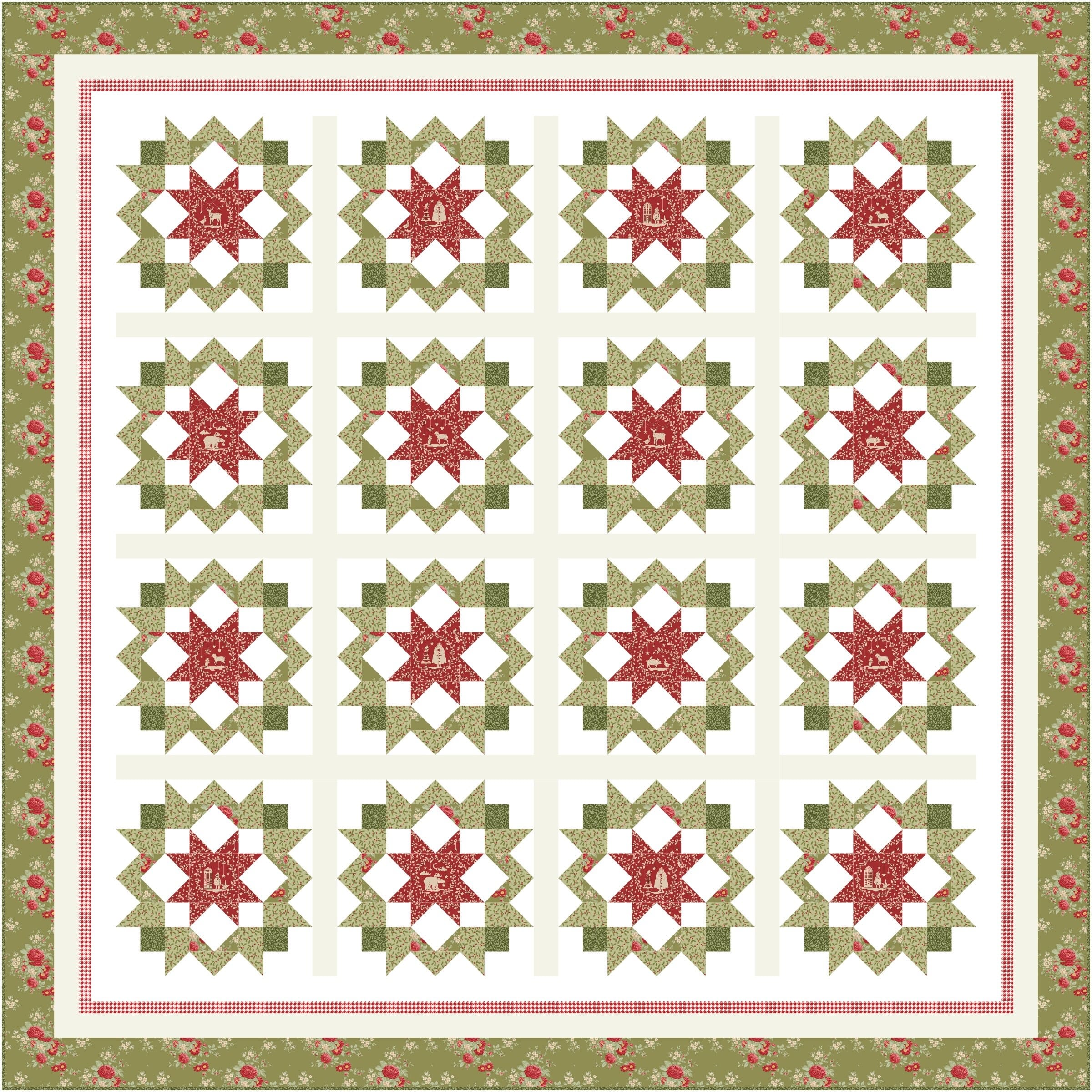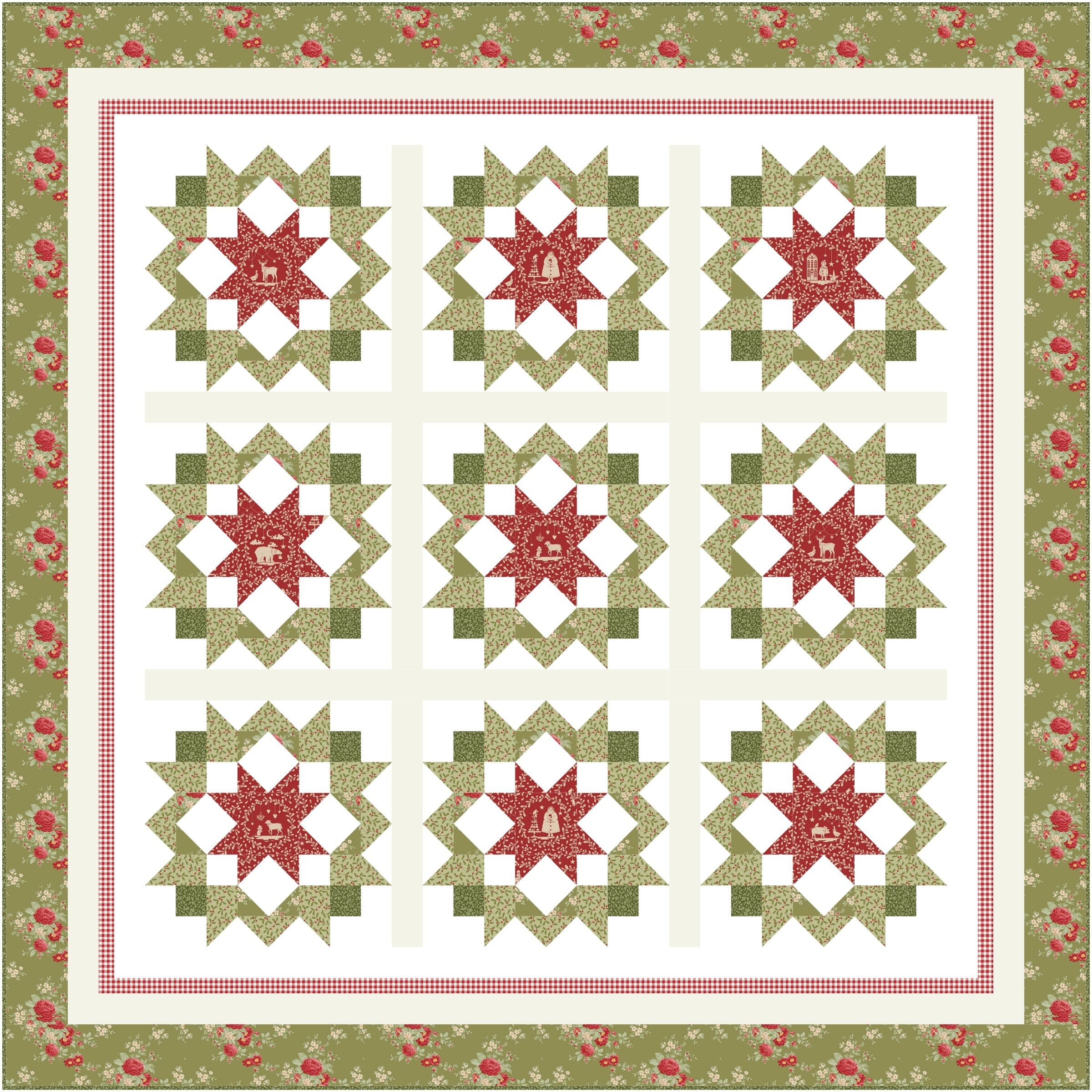 This charming Christmas quilt pattern features stars nestled inside evergreen wreaths, creating a timeless holiday design. The beautiful wreaths look like theyβre hanging in a frosted window, ready to greet you with Christmas cheer. Pattern includes 4 sizes – table runner to queen size.