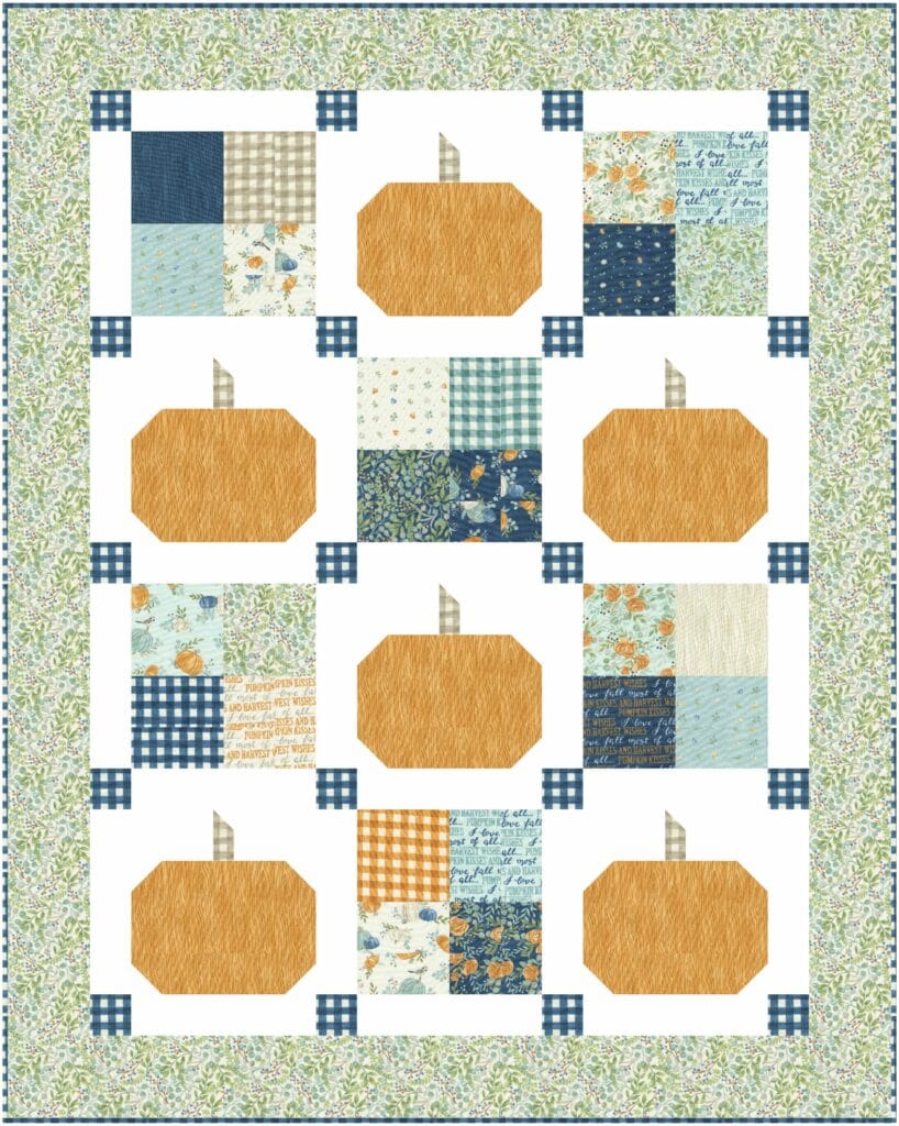 But this quilt would also be equally gorgeous to feature orange pumpkins. I’ve done a mock up for you in the Harvest Wishes fabric collection which is also by Deb Strain and here it’s shown in the small throw size.